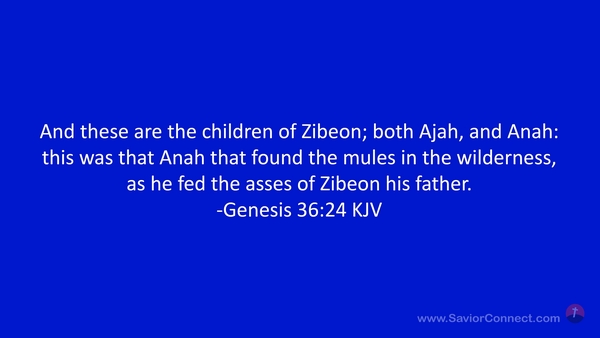 And these are the children of Zibeon; both Ajah, and Anah: this was that Anah that found the mules in the wilderness, as he fed the asses of Zibeon his father. -Genesis 36:24 KJV