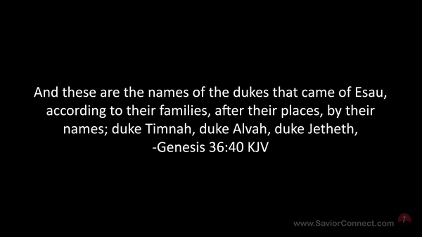 And these are the names of the dukes that came of Esau, according to their families, after their places, by their names; duke Timnah, duke Alvah, duke Jetheth, -Genesis 36:40 KJV