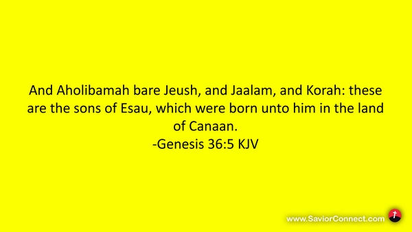 And Aholibamah bare Jeush, and Jaalam, and Korah: these are the sons of Esau, which were born unto him in the land of Canaan. -Genesis 36:5 KJV