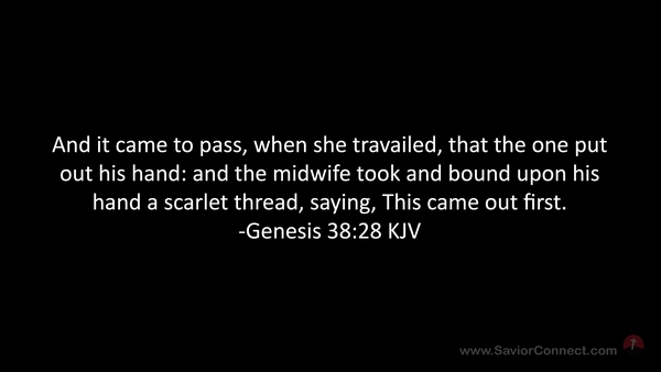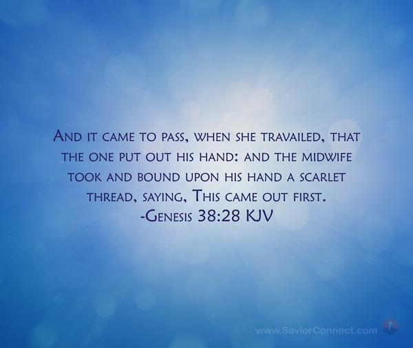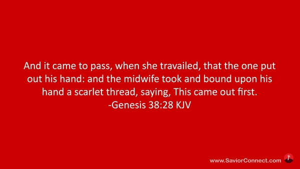 And it came to pass, when she travailed, that the one put out his hand: and the midwife took and bound upon his hand a scarlet thread, saying, This came out first. -Genesis 38:28 KJV