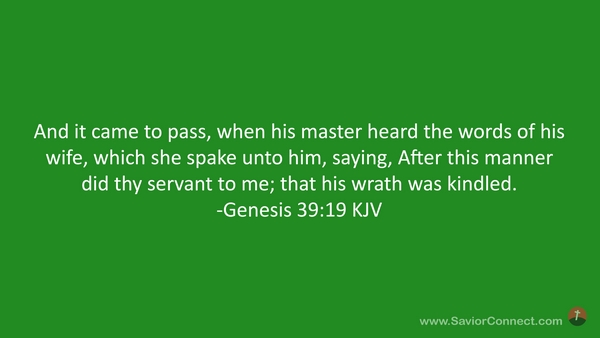 And it came to pass, when his master heard the words of his wife, which she spake unto him, saying, After this manner did thy servant to me; that his wrath was kindled. -Genesis 39:19 KJV