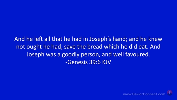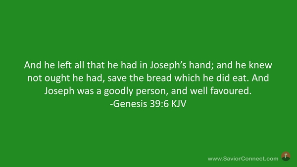 And he left all that he had in Joseph's hand; and he knew not ought he had, save the bread which he did eat. And Joseph was a goodly person, and well favoured. -Genesis 39:6 KJV