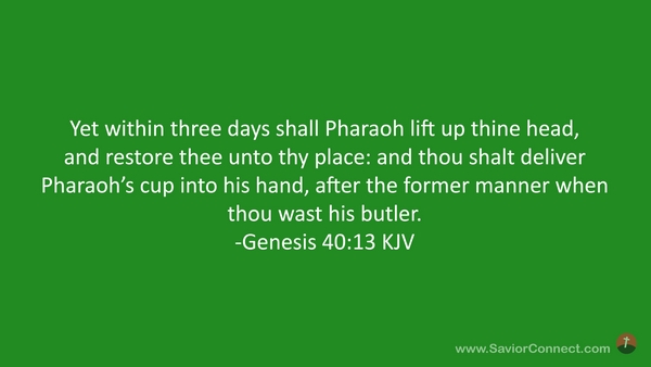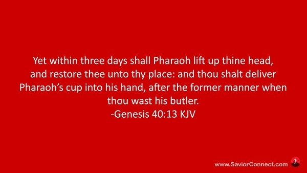 Yet within three days shall Pharaoh lift up thine head, and restore thee unto thy place: and thou shalt deliver Pharaoh's cup into his hand, after the former manner when thou wast his butler. -Genesis 40:13 KJV