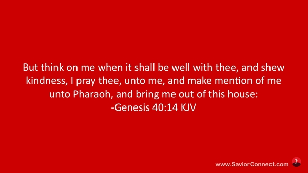 But think on me when it shall be well with thee, and shew kindness, I pray thee, unto me, and make mention of me unto Pharaoh, and bring me out of this house: -Genesis 40:14 KJV