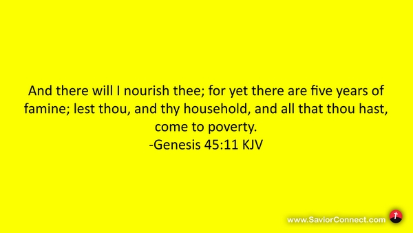 And there will I nourish thee; for yet there are five years of famine; lest thou, and thy household, and all that thou hast, come to poverty. -Genesis 45:11 KJV