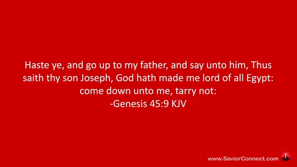 Haste ye, and go up to my father, and say unto him, Thus saith thy son Joseph, God hath made me lord of all Egypt: come down unto me, tarry not: -Genesis 45:9 KJV