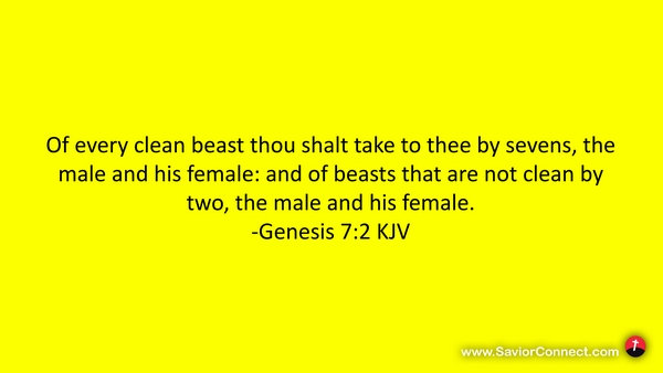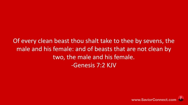 Of every clean beast thou shalt take to thee by sevens, the male and his female: and of beasts that are not clean by two, the male and his female. -Genesis 7:2 KJV