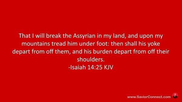 That I will break the Assyrian in my land, and upon my mountains tread him under foot: then shall his yoke depart from off them, and his burden depart from off their shoulders. -Isaiah 14:25 KJV