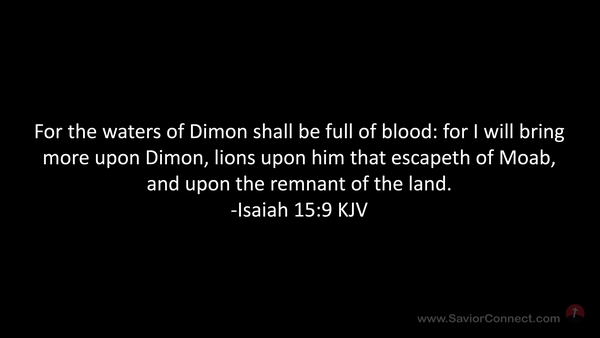 For the waters of Dimon shall be full of blood: for I will bring more upon Dimon, lions upon him that escapeth of Moab, and upon the remnant of the land. -Isaiah 15:9 KJV