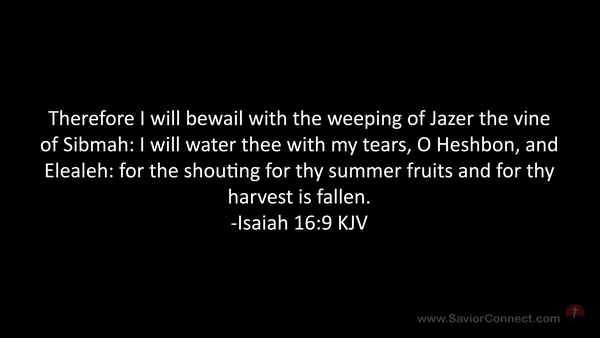 Therefore I will bewail with the weeping of Jazer the vine of Sibmah: I will water thee with my tears, O Heshbon, and Elealeh: for the shouting for thy summer fruits and for thy harvest is fallen. -Isaiah 16:9 KJV