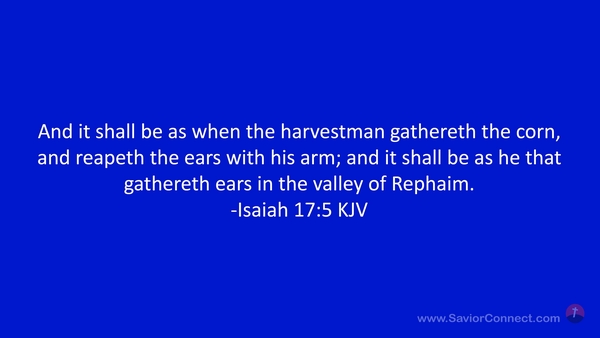 And it shall be as when the harvestman gathereth the corn, and reapeth the ears with his arm; and it shall be as he that gathereth ears in the valley of Rephaim. -Isaiah 17:5 KJV