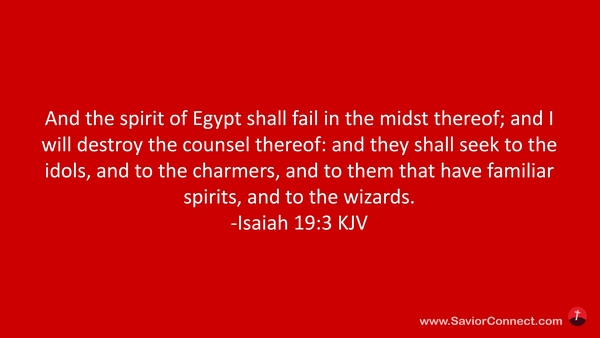 And the spirit of Egypt shall fail in the midst thereof; and I will destroy the counsel thereof: and they shall seek to the idols, and to the charmers, and to them that have familiar spirits, and to the wizards. -Isaiah 19:3 KJV