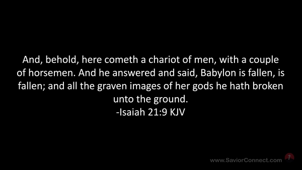 And, behold, here cometh a chariot of men, with a couple of horsemen. And he answered and said, Babylon is fallen, is fallen; and all the graven images of her gods he hath broken unto the ground. -Isaiah 21:9 KJV