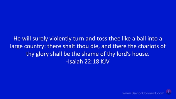 He will surely violently turn and toss thee like a ball into a large country: there shalt thou die, and there the chariots of thy glory shall be the shame of thy lord's house. -Isaiah 22:18 KJV