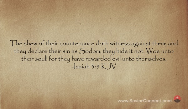 The shew of their countenance doth witness against them; and they declare their sin as Sodom, they hide it not. Woe unto their soul! for they have rewarded evil unto themselves. -Isaiah 3:9 KJV