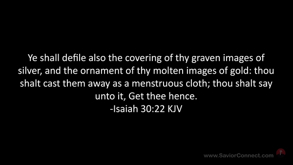 Ye shall defile also the covering of thy graven images of silver, and the ornament of thy molten images of gold: thou shalt cast them away as a menstruous cloth; thou shalt say unto it, Get thee hence. -Isaiah 30:22 KJV