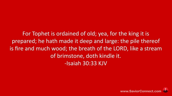 For Tophet is ordained of old; yea, for the king it is prepared; he hath made it deep and large: the pile thereof is fire and much wood; the breath of the LORD, like a stream of brimstone, doth kindle it. -Isaiah 30:33 KJV