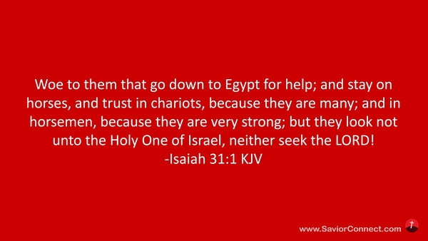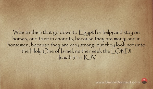 Woe to them that go down to Egypt for help; and stay on horses, and trust in chariots, because they are many; and in horsemen, because they are very strong; but they look not unto the Holy One of Israel, neither seek the LORD! -Isaiah 31:1 KJV