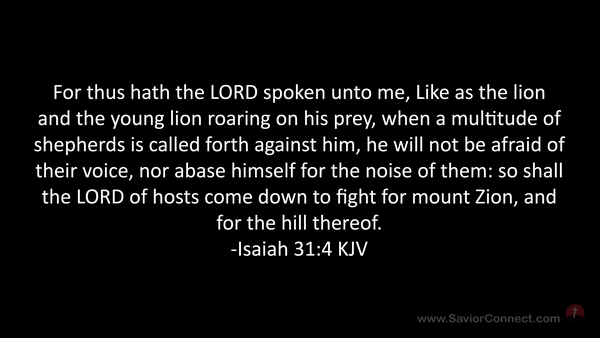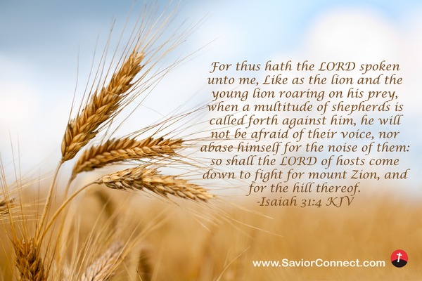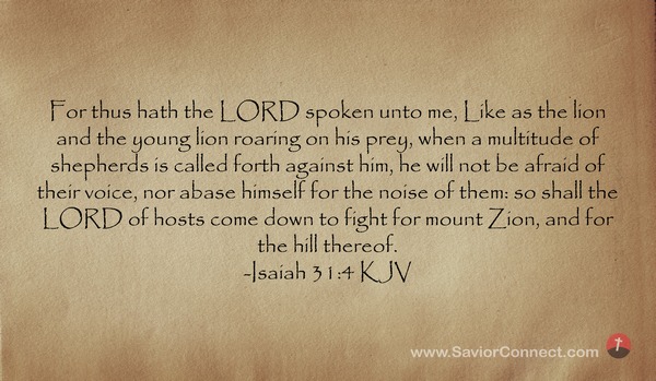 For thus hath the LORD spoken unto me, Like as the lion and the young lion roaring on his prey, when a multitude of shepherds is called forth against him, he will not be afraid of their voice, nor abase himself for the noise of them: so shall the LORD of hosts come down to fight for mount Zion, and for the hill thereof. -Isaiah 31:4 KJV