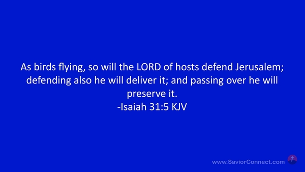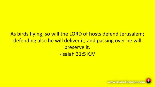 As birds flying, so will the LORD of hosts defend Jerusalem; defending also he will deliver it; and passing over he will preserve it. -Isaiah 31:5 KJV