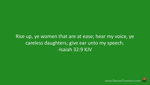 Rise up, ye women that are at ease; hear my voice, ye careless daughters; give ear unto my speech. -Isaiah 32:9 KJV