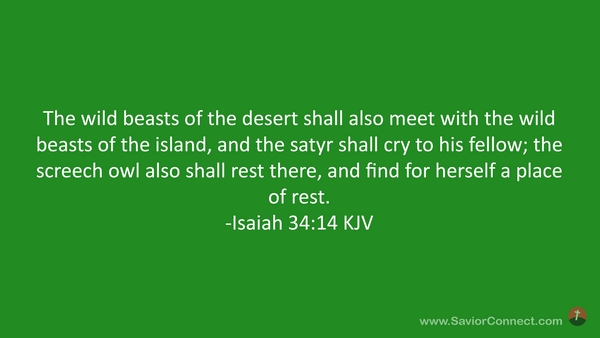 The wild beasts of the desert shall also meet with the wild beasts of the island, and the satyr shall cry to his fellow; the screech owl also shall rest there, and find for herself a place of rest. -Isaiah 34:14 KJV