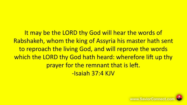 It may be the LORD thy God will hear the words of Rabshakeh, whom the king of Assyria his master hath sent to reproach the living God, and will reprove the words which the LORD thy God hath heard: wherefore lift up thy prayer for the remnant that is left. -Isaiah 37:4 KJV