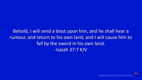 Behold, I will send a blast upon him, and he shall hear a rumour, and return to his own land; and I will cause him to fall by the sword in his own land. -Isaiah 37:7 KJV