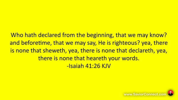 Who hath declared from the beginning, that we may know? and beforetime, that we may say, He is righteous? yea, there is none that sheweth, yea, there is none that declareth, yea, there is none that heareth your words. -Isaiah 41:26 KJV