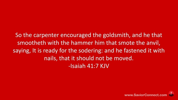 So the carpenter encouraged the goldsmith, and he that smootheth with the hammer him that smote the anvil, saying, It is ready for the sodering: and he fastened it with nails, that it should not be moved. -Isaiah 41:7 KJV