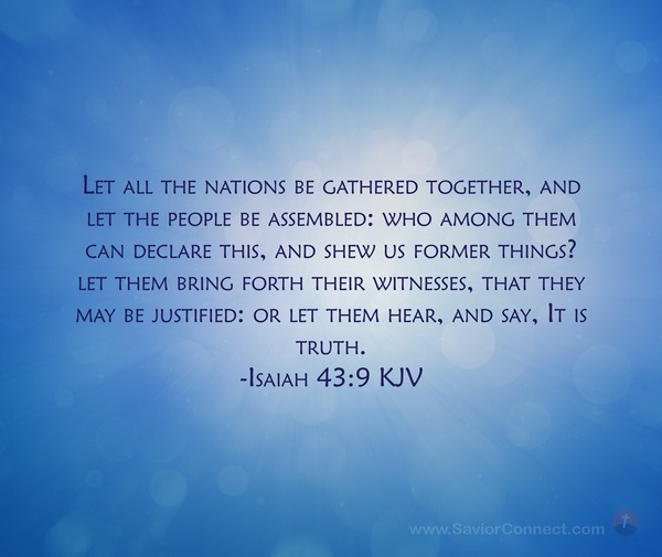 Let all the nations be gathered together, and let the people be assembled: who among them can declare this, and shew us former things? let them bring forth their witnesses, that they may be justified: or let them hear, and say, It is truth. -Isaiah 43:9 KJV