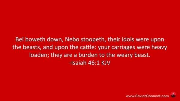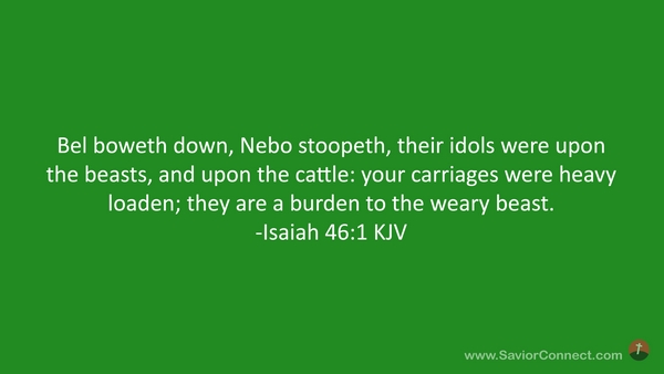 Bel boweth down, Nebo stoopeth, their idols were upon the beasts, and upon the cattle: your carriages were heavy loaden; they are a burden to the weary beast. -Isaiah 46:1 KJV