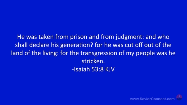 He was taken from prison and from judgment: and who shall declare his generation? for he was cut off out of the land of the living: for the transgression of my people was he stricken. -Isaiah 53:8 KJV