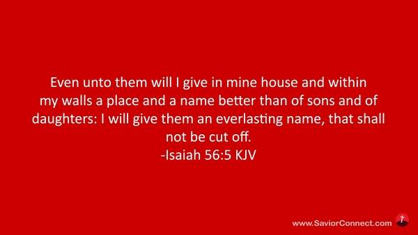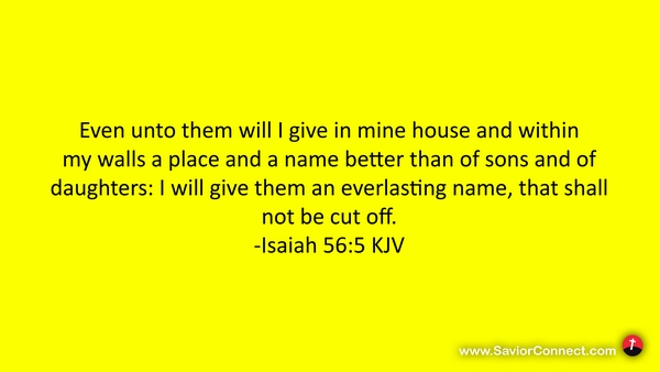 Even unto them will I give in mine house and within my walls a place and a name better than of sons and of daughters: I will give them an everlasting name, that shall not be cut off. -Isaiah 56:5 KJV