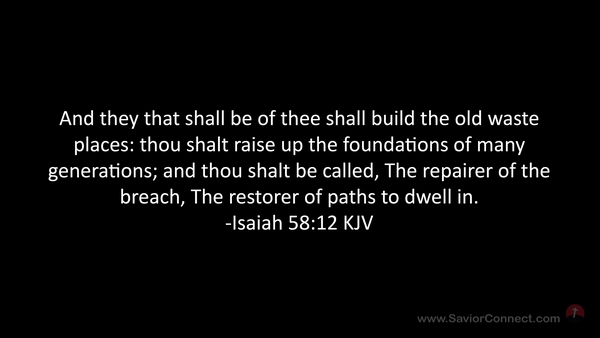 And they that shall be of thee shall build the old waste places: thou shalt raise up the foundations of many generations; and thou shalt be called, The repairer of the breach, The restorer of paths to dwell in. -Isaiah 58:12 KJV