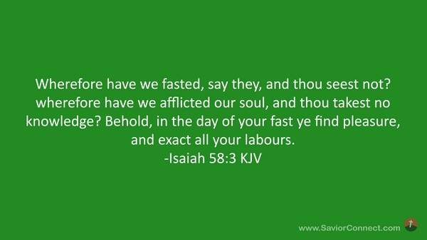 Wherefore have we fasted, say they, and thou seest not? wherefore have we afflicted our soul, and thou takest no knowledge? Behold, in the day of your fast ye find pleasure, and exact all your labours. -Isaiah 58:3 KJV