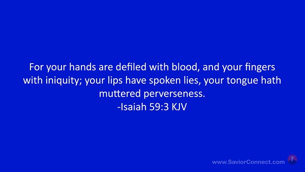 For your hands are defiled with blood, and your fingers with iniquity; your lips have spoken lies, your tongue hath muttered perverseness. -Isaiah 59:3 KJV
