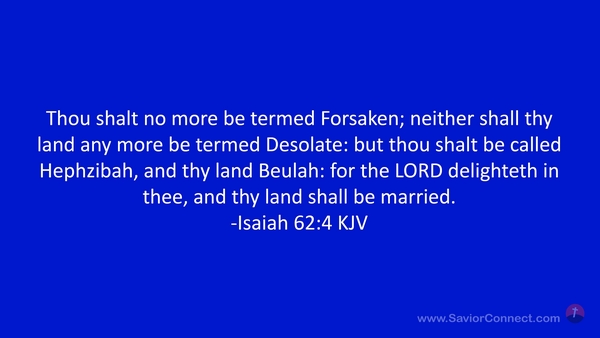 Thou shalt no more be termed Forsaken; neither shall thy land any more be termed Desolate: but thou shalt be called Hephzibah, and thy land Beulah: for the LORD delighteth in thee, and thy land shall be married. -Isaiah 62:4 KJV