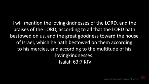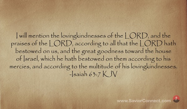 I will mention the lovingkindnesses of the LORD, and the praises of the LORD, according to all that the LORD hath bestowed on us, and the great goodness toward the house of Israel, which he hath bestowed on them according to his mercies, and according to the multitude of his lovingkindnesses. -Isaiah 63:7 KJV