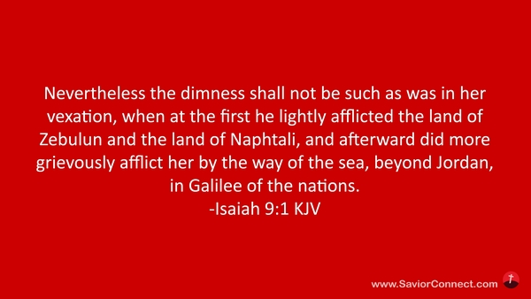 Nevertheless the dimness shall not be such as was in her vexation, when at the first he lightly afflicted the land of Zebulun and the land of Naphtali, and afterward did more grievously afflict her by the way of the sea, beyond Jordan, in Galilee of the nations. -Isaiah 9:1 KJV