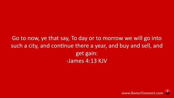 Go to now, ye that say, To day or to morrow we will go into such a city, and continue there a year, and buy and sell, and get gain: -James 4:13 KJV