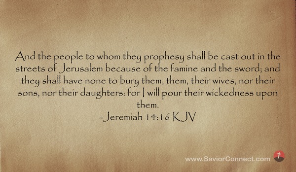 And the people to whom they prophesy shall be cast out in the streets of Jerusalem because of the famine and the sword; and they shall have none to bury them, them, their wives, nor their sons, nor their daughters: for I will pour their wickedness upon them. -Jeremiah 14:16 KJV