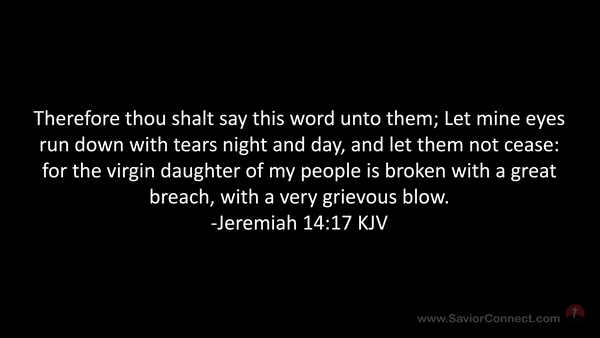 Therefore thou shalt say this word unto them; Let mine eyes run down with tears night and day, and let them not cease: for the virgin daughter of my people is broken with a great breach, with a very grievous blow. -Jeremiah 14:17 KJV