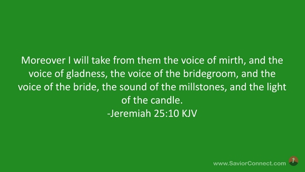 Moreover I will take from them the voice of mirth, and the voice of gladness, the voice of the bridegroom, and the voice of the bride, the sound of the millstones, and the light of the candle. -Jeremiah 25:10 KJV