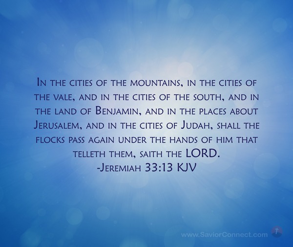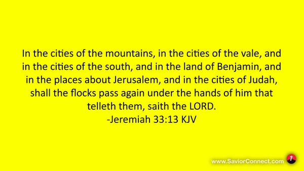 In the cities of the mountains, in the cities of the vale, and in the cities of the south, and in the land of Benjamin, and in the places about Jerusalem, and in the cities of Judah, shall the flocks pass again under the hands of him that telleth them, saith the LORD. -Jeremiah 33:13 KJV