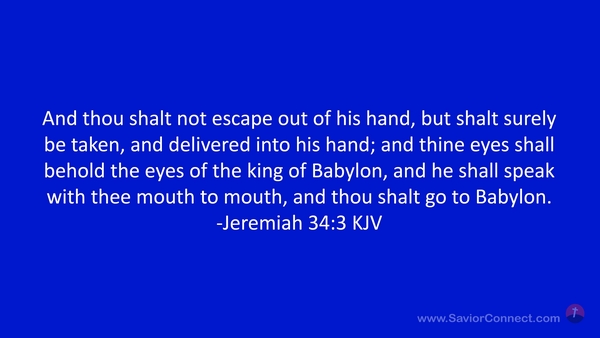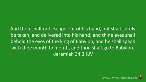 And thou shalt not escape out of his hand, but shalt surely be taken, and delivered into his hand; and thine eyes shall behold the eyes of the king of Babylon, and he shall speak with thee mouth to mouth, and thou shalt go to Babylon. -Jeremiah 34:3 KJV