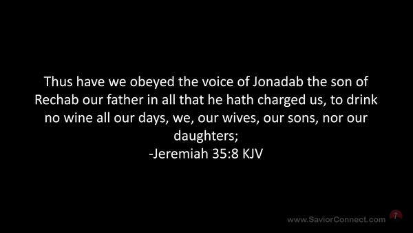 Thus have we obeyed the voice of Jonadab the son of Rechab our father in all that he hath charged us, to drink no wine all our days, we, our wives, our sons, nor our daughters; -Jeremiah 35:8 KJV