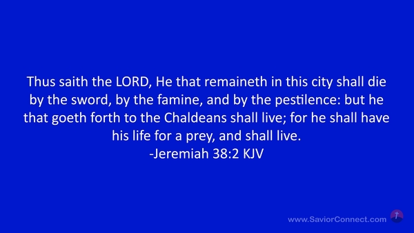 Thus saith the LORD, He that remaineth in this city shall die by the sword, by the famine, and by the pestilence: but he that goeth forth to the Chaldeans shall live; for he shall have his life for a prey, and shall live. -Jeremiah 38:2 KJV