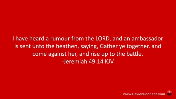 I have heard a rumour from the LORD, and an ambassador is sent unto the heathen, saying, Gather ye together, and come against her, and rise up to the battle. -Jeremiah 49:14 KJV
