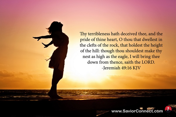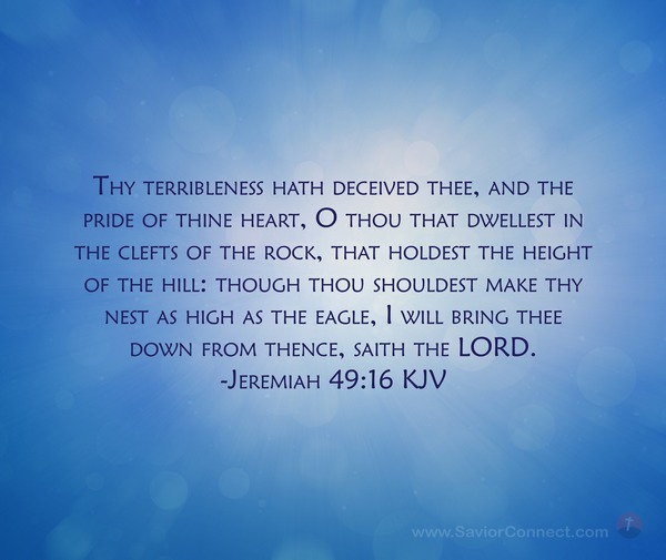 Thy terribleness hath deceived thee, and the pride of thine heart, O thou that dwellest in the clefts of the rock, that holdest the height of the hill: though thou shouldest make thy nest as high as the eagle, I will bring thee down from thence, saith the LORD. -Jeremiah 49:16 KJV